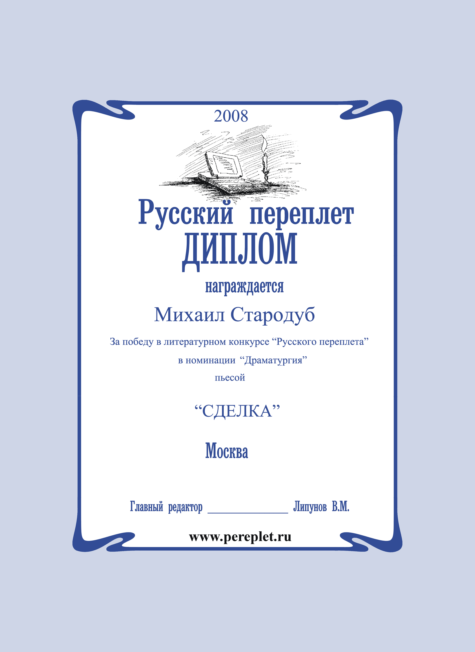 Кстати, хочу напомнить, что Михаил Стародуб и в Русском переплёте был отмечен победителем в разделе "Драматургия".