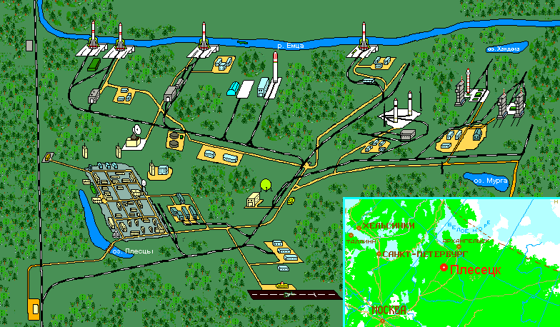 Космодром ⌠Плесецк■ (1-й Государственный испытательный космодром) расположен в 180 километрах к югу от Архангельска неподалеку от железнодорожной станции Плесецкая Северной железной дороги. Распологаясь на платообразной и слегка холмистой равнине, он занимает площадь 1762 квадратных километра, простираясь с севера на юг на 46 километров и с востока на запад на 82 километра с центром, имеющим географические координаты 63 градуса северной широты и 41 градус восточной долготы. История космодрома начинается с Постановления ЦК КПСС и Совета Министров СССР от 11 января 1957 года, когда было принято решение о создании военного объекта с условным наименованием ⌠Ангара■ - первого соединения межконтинентальных баллистических ракет ⌠Р-7■. В том же году началось строительство первых стартовых комплексов. При выборе местоположения объекта в первую очередь учитывались: