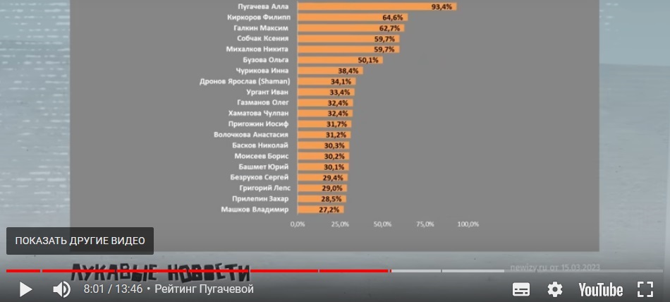 Она приезжала в Россию по каким-то делам, уехала и огрызается на недобрый приём где-то. Открытым письмом. То есть и мне, получается. Мне – как идейному антагонисту (проколлективисту) – в первую очередь. А я её презирал уже десятки лет тому назад. За воинствующее мещанство. Втихомолку. Потому что всё больше и больше скатывавшаяся в мещанство же страна её обоснованно и глубоко любила. И неминуемо любит и теперь, ибо народ, дойдя до апогея в мещанстве (страна аж соответственно вернулась в капитализм), хоть стала понемногу приходить в себя (от компрадорского капитализма – от удовольствия от подачек барской руки {метропольного Запада}), но… Процесс этого освобождения долгий. Хоть он с 24.02.2022 начал ускоряться. Хоть Пугачёва от омерзения к этому “начал” удрала из страны. (И тем – молодец: как думает, так и живёт, никого не боясь.) И права Пугачёва и в своём переживании сверхценности индивидуализма, и в своём духовном единстве с теми, кому индивидуализм тоже сверхценен: “Хотите вы этого или нет [проколлективисты, как я, да и большинство народа, поддерживающего СВО на Украине], но жизнь показывает, что я до сих пор в ваших сердцах” (https://meduza.io/feature/2023/11/11/ya-postarayus-dozhit-do-pobedy-sveta-nad-tmoy-pobedy-dobra-nad-zlom-pobedy-pravdy-nad-klevetoy). Я из логики исходя, согласен, что она права в своём оптимизме. Но это – только из логики. Найти в русскоязычном интернете какой-то дифирамб Пугачёвой, высказанный ей за три дня её пребывания в России я не смог. Правда, наткнулся на такое: “…обратимся к настоящему профессиональному исследованию, которое проводили эксперты Дигитал Агентства Империал. На основе мониторинга российских СМИ они составили рейтинг самых упоминаемых творческих персон России за прошлый год. Сказать, что Алла Пугачёва возглавила этот рейтинг, это не сказать ничего. Давайте посмотрим”