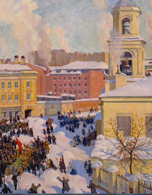 Кустодиев. 27 февраля 1917 года. 1917. Тут сталкиваются два “хорошо”: отличный солнечный морозный день (розовый снег, теплого оттенка дома) – образ доброго старого времени и образ времени нового, революционного (цвета контрастного: тёмного, вплоть до чёрного). Кустодиев иронизирует над тем и другим. Он вдохновлён идеалом типа барокко, формула идеостиля у которого – соединение несоединимого. Но в это нельзя ткнуть указкой – значит, для большинства искусствоведов, барокко тут нет. Долинина ещё молодец, что заметила несхожесть того, что видят глаза, с политическим событием. Она словами: “Кустодиев аутичен. Он сочинитель, талант которого возбуждается исключительно от погружения в созданный воображением текст”, - почти сказала то, что и я говорю, что видимое не равно сути. 1 января 2023 г. |